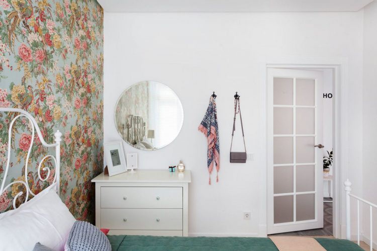 Bức tường nơi đầu giường ngủ được sử dụng giấy dán tường họa tiết hoa lá nhiều màu sắc.